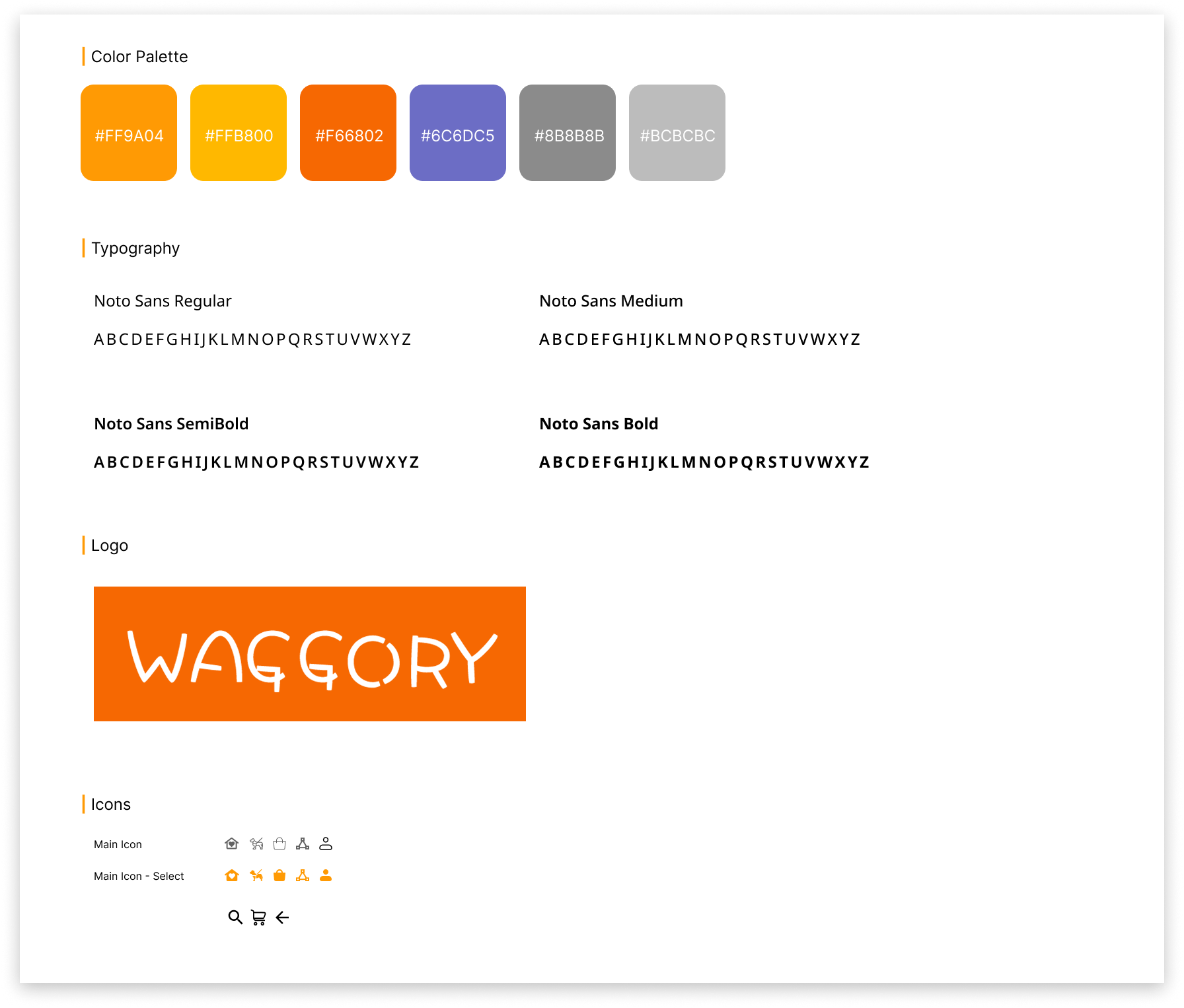 To ensure visual consistency and brand recognition across the app, I developed a style guide that defines the core elements of Waggory’s UI
