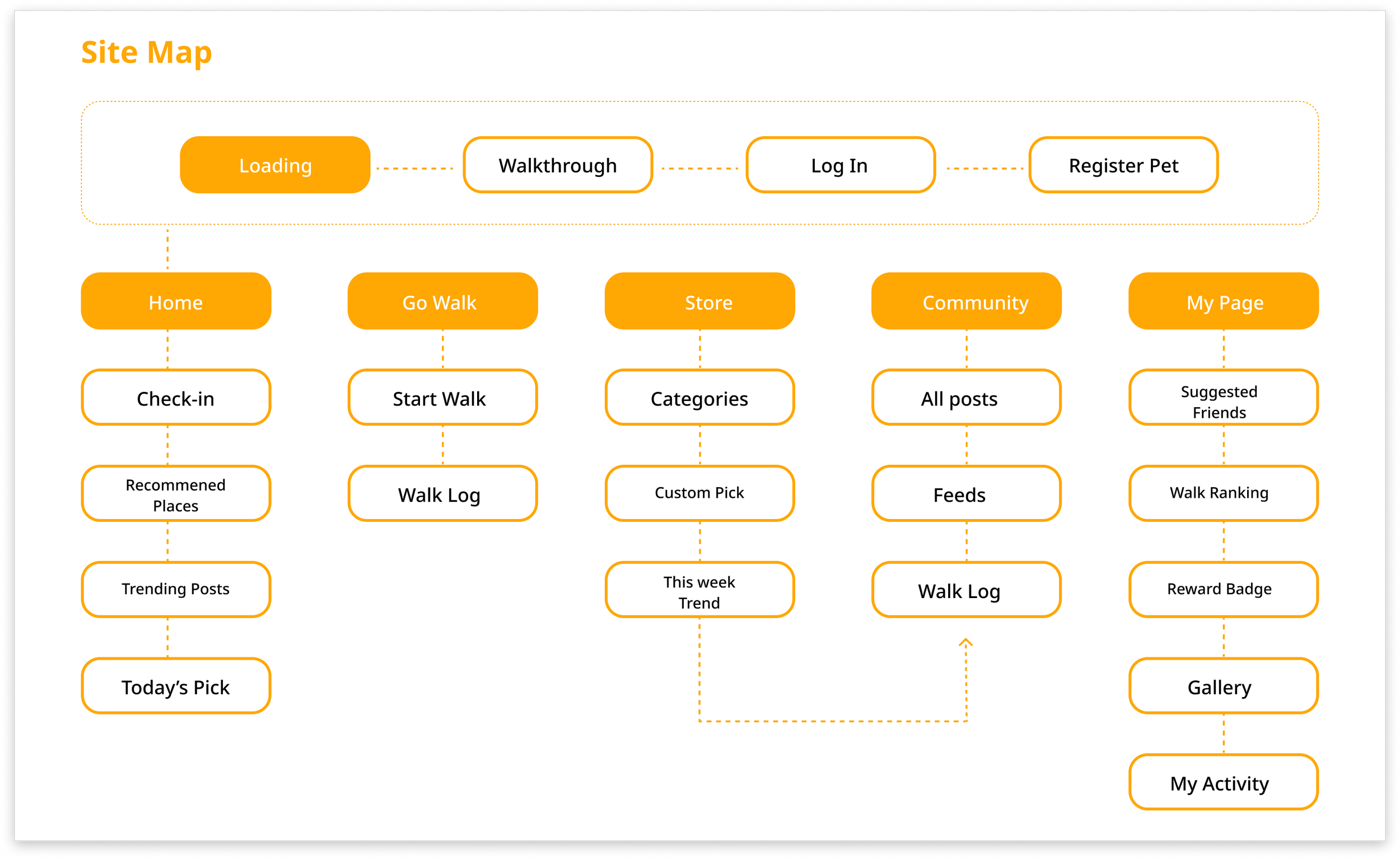 To support ease of use during walks, the site map was designed to be intuitive and minimal. Key features were prioritized and laid out in a way that allows users to quickly access what they need while walking their dogs.